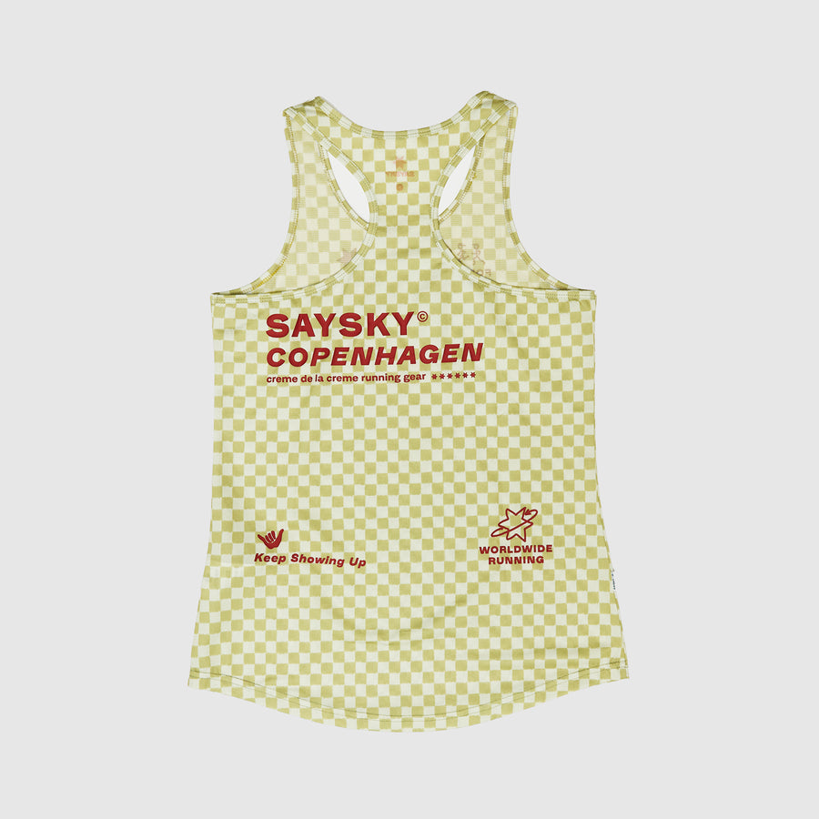 El SAYSKY Checker Combat Singlet es un singlet de competición para mujer, con un estampado completo en diseño checker (cuadrillé) y frases motivacionales que te acompañan kilómetro a kilómetro.